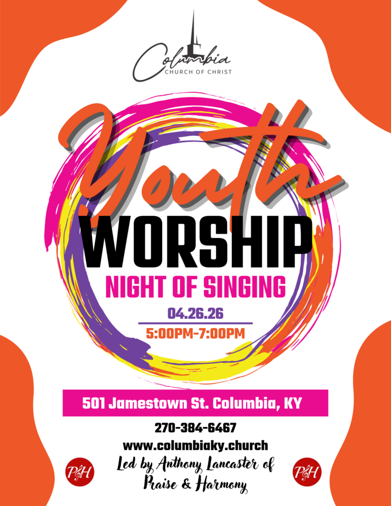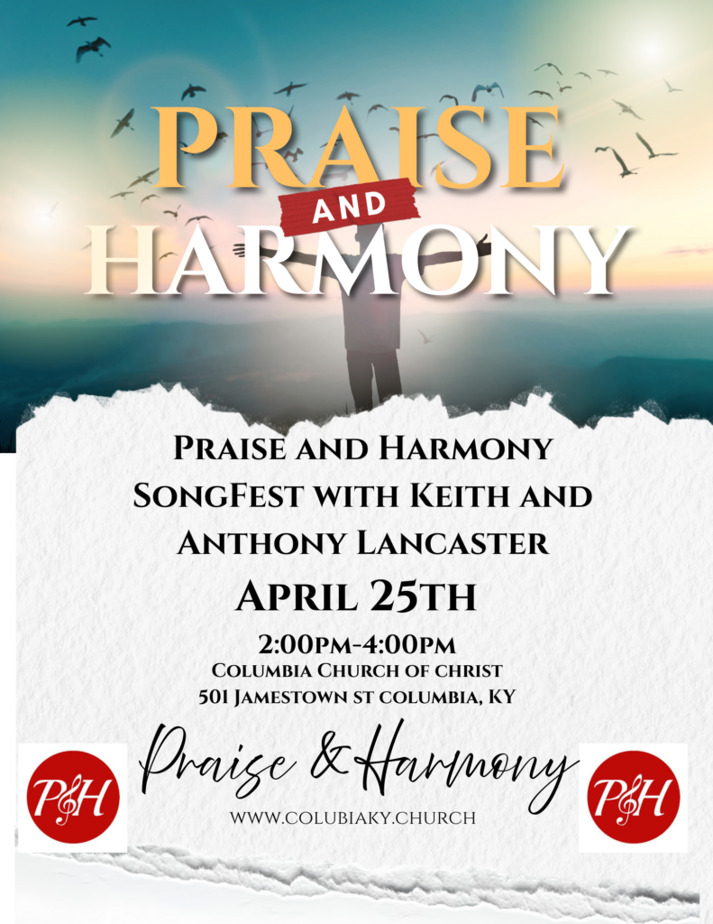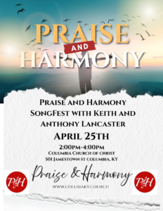 We would love for you to join us Saturday April 25th and Sunday April 26th for our Praise & Harmony SongFest Events. Saturday will be our acapella singing event from 2:00 – 4:00 led my Keith & Anthony Lancaster. On Sunday we will worship beginning at 9:30 a.m. Sunday evening we will have a youth acapella singing event beginning at 5:00 p.m. For more info please email columbiakycoc@gmail.com